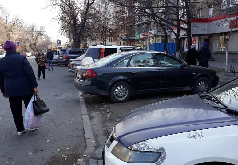 Мэрия убрала парковки вдоль проспекта Манаса, водители паркуются где придется. На пересечении с улицей Киевской, например, машины стоят там, где летом был газон.