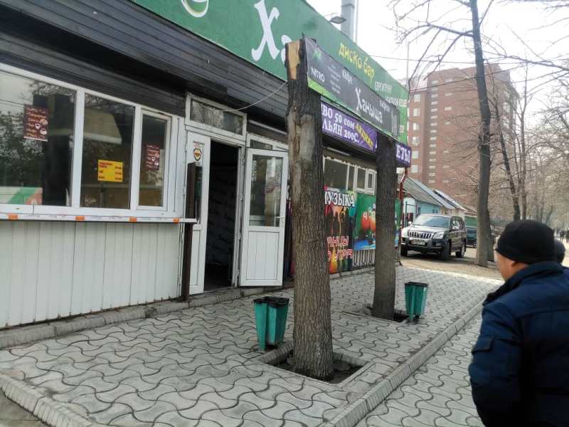 Кафе-бар «Ханыша» на пересечении Жибек Жолу и Тыныстанова в Бишкеке изуродовал деревья и приспособил их под вывеску. Об этом сообщил читатель.