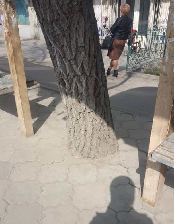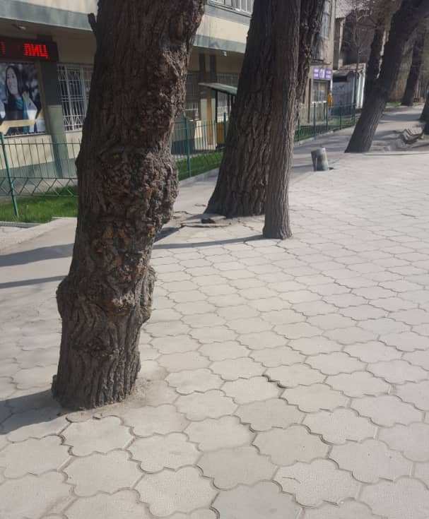 В Бишкеке, на остановке на перекрестке улиц Токтогула и Уметалиева, заасфальтировали корни деревьев. Об этом 24-kg.com сообщил читатель.