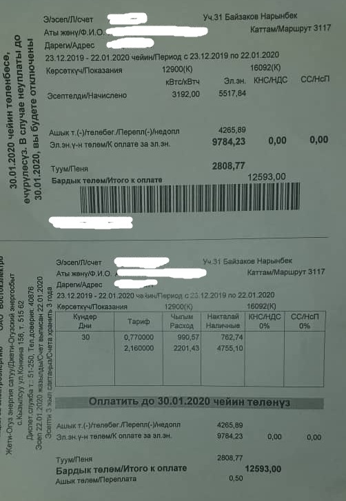 Жительница села Тамга Джети-Огузского района Иссык-Кульской области сегодня получила счет от ОАО «Востокэлектро» на оплату за электроэнергию на 12 тысяч 592 сома. Фото квитанции читательница прислала 24-kg.com.