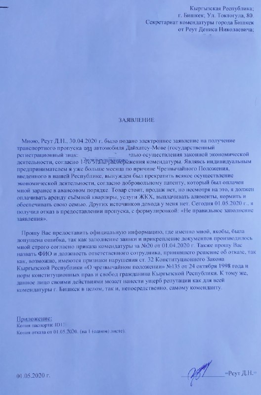 «Я, как и многие другие, больше месяца сижу дома, не могу осуществлять экономическую деятельность. Но платить за квартиру надо, оплачивать за коммунальные услуги надо, кормить семью надо. Но как это сделать без заработка? Я заполнил заявку на получение пропуска согласно первому этапу возобновления экономической деятельности в режиме ЧП, но мне отказали с формулировкой «неправильное заполнение заявления». Это коррупция так проявляется? Они хотят, чтобы я деньги дал? Я написал заявление в секретариат комендатуры, чтобы они предоставили полную информацию, где я допустил ошибки и как зовут того человека, который проверял мою заявку», — сказал он.
