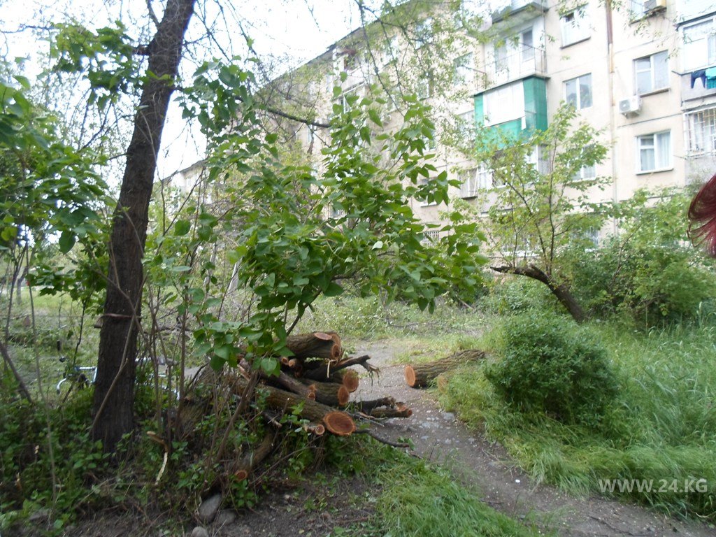 Возле дома № 21 в 10-м микрорайоне Бишкека срубили деревья и кусты сирени. Об этом 24-kg.com сообщил читатель.