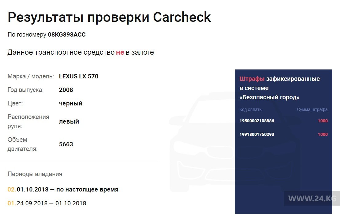Сервис Carcheck показал, что у водителя этого автомобиля имеется задолженность по штрафам в размере 2 тысяч сомов.