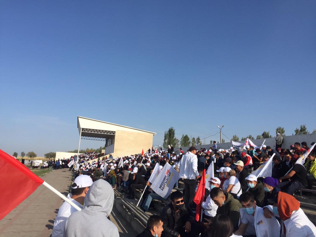 Партия «Мекеним Кыргызстан» собрала на ипподроме в Сокулуке несколько тысяч человек. При этом многие присутствующие без масок, также никто не соблюдает дистанцию. Об этом сообщают в социальных сетях.