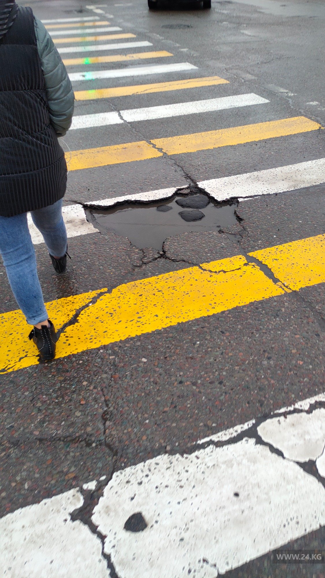 Яма на пешеходном переходе в Бишкеке создает аварийную ситуацию на дороге. Об этом 24-kg.com сообщил читатель.