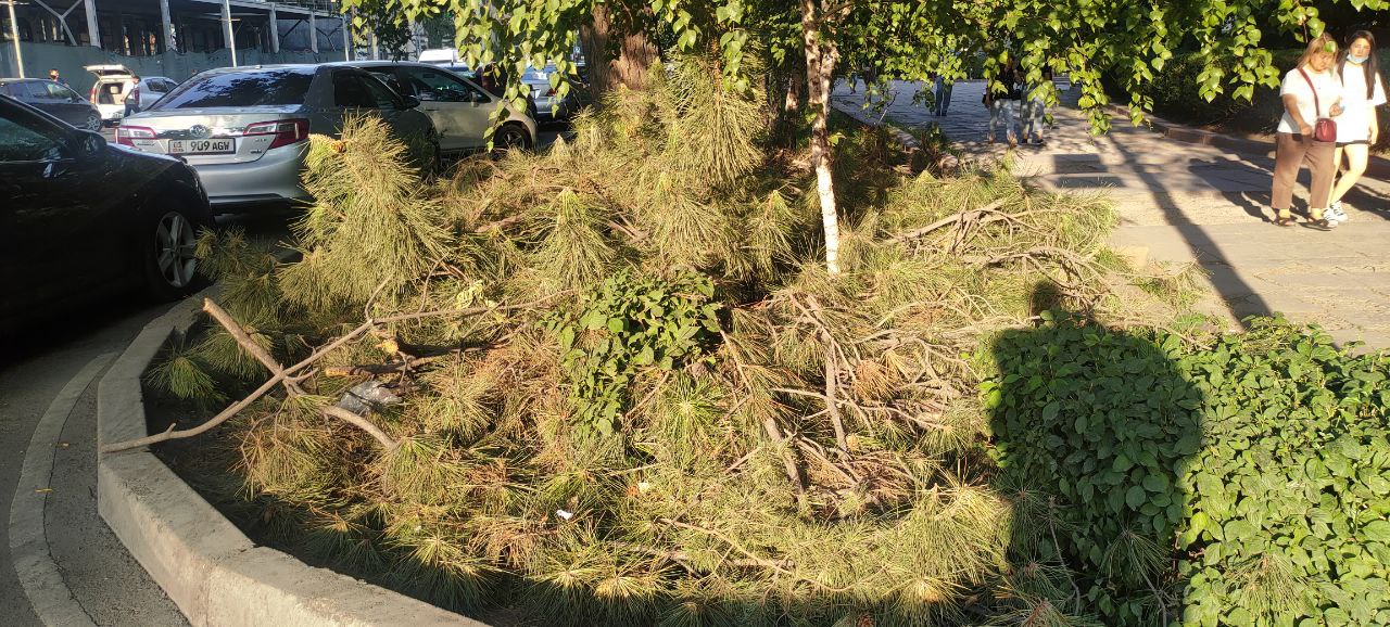 В Бишкеке возле здания КРСУ на улице Киевской спилили хвойные деревья, а ветки оставили на газоне. Об этом 24-kg.com сообщил читатель.