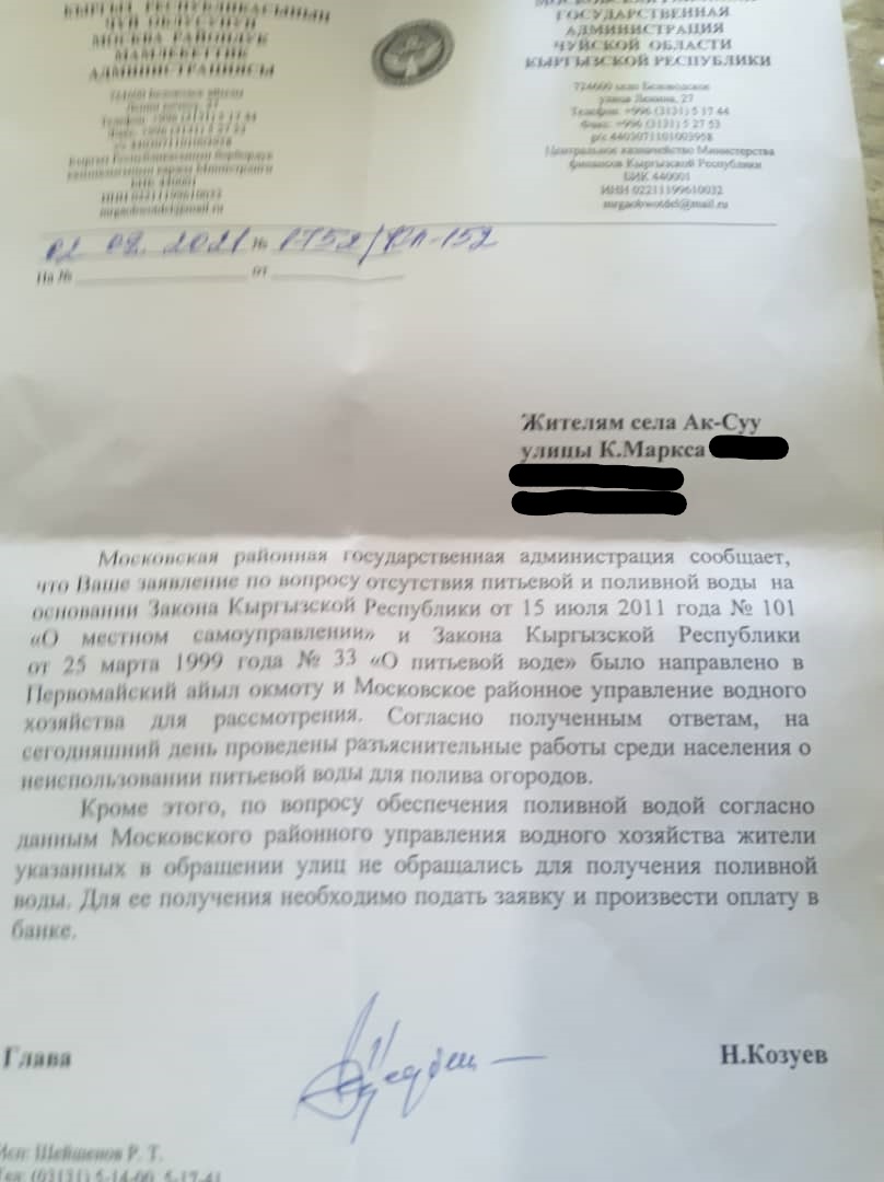 Глава Московского района Чуйской области Ниязбек Козуев ответил жителям села Ак-Суу, пожаловавшимся в 24-kg.com на отсутствие питьевой и поливной воды. Об этом редакции сообщил читатель.