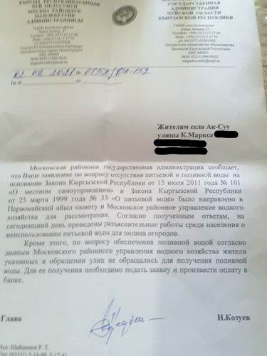 Напомним, 28 июля жители села Ак-Суу Чуйской области обратились в редакцию с жалобами на отсутствие воды, а также на сомнительные квитанции по оплате за не оказанную по факту услугу.