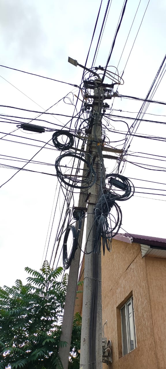 На опасное переплетение проводов на столбе в Бишкеке жалуется горожанин. Об этом 24-kg.com сообщил читатель.