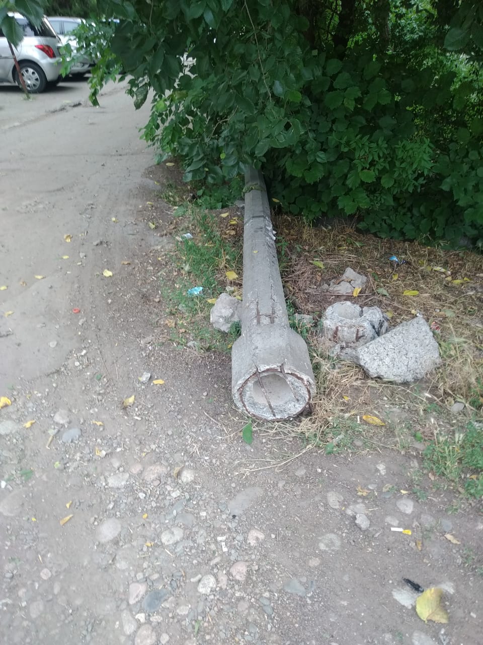 «Между домами № 19 и 20 есть дорога, ведущая вглубь микрорайона. При помощи СМИ МП «Бишкексвет» установило освещение — три прожектора на старых опорах. Одна из них упала. Провода и кабели висят близко от земли, проезжают машины, ходят жители и играют дети. Они опасны для них. Было бы хорошо, если бы восстановили опору и освещение», — написал житель столицы.