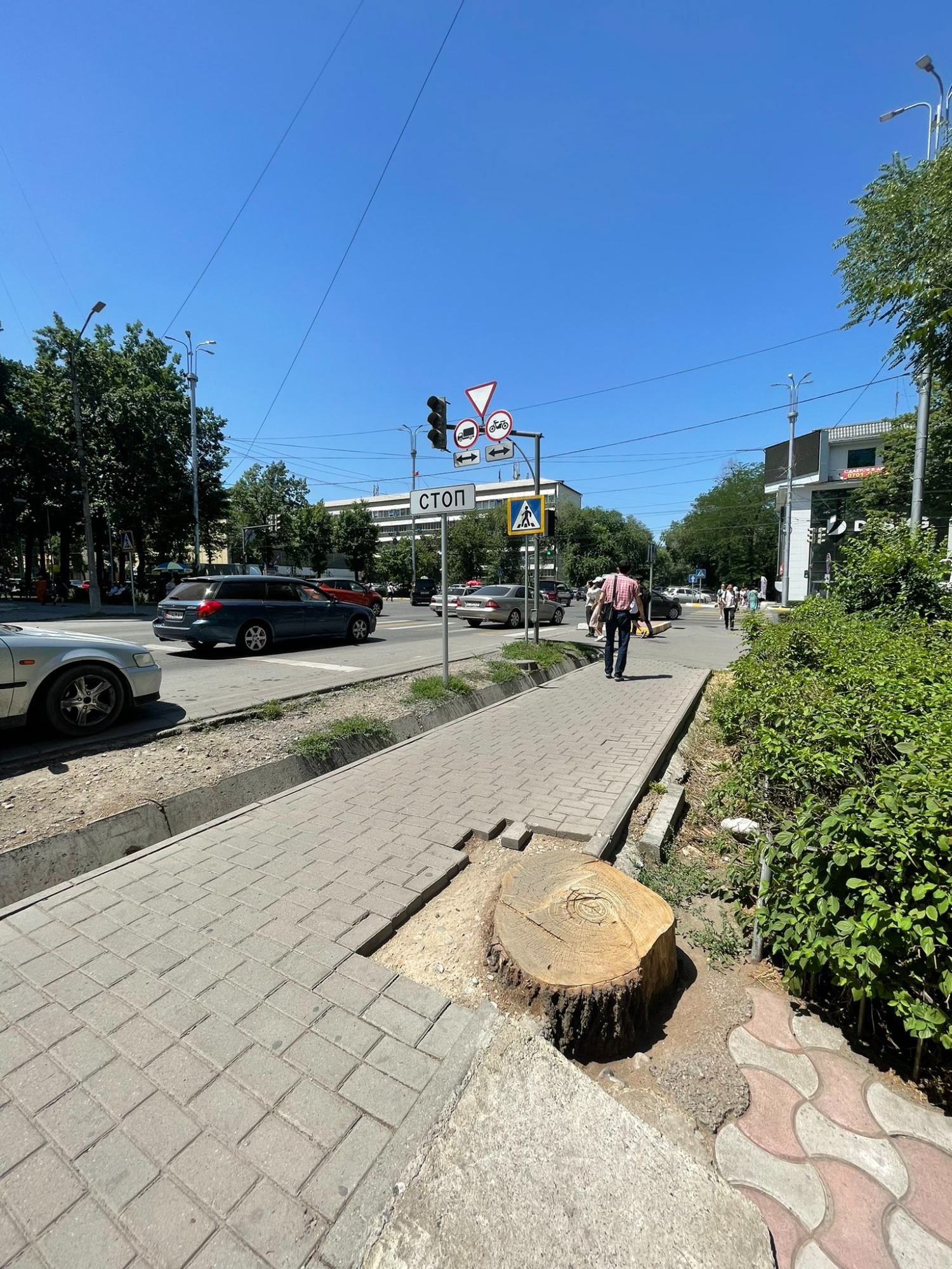 Сообщается также о вырубке деревьев на пересечении проспекта Манаса и улицы Токтогула.«Спилили два дерева. Угол теперь совсем лысый. Судя по пням, деревья могли стоять еще долгое время. Теперь же уродливый угол, изуродованный тротуар и пни, которые будут бессмысленно торчать на дороге. Для чего повалили эти деревья?» — пишет другой житель столицы.