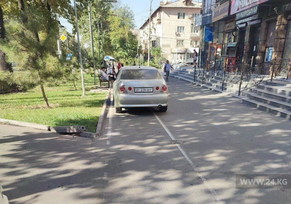 В районе пересечения улицы Токтогула и проспекта Манаса автомобилем загородили тротуар и велосипедную дорожку.