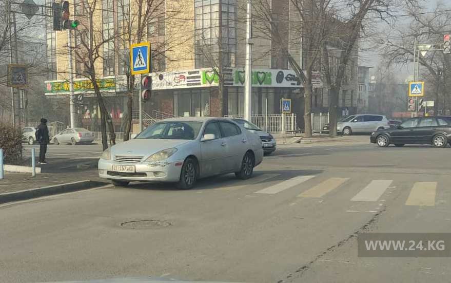 На перекрестке Ахунбаева — Малдыбаева машину поставили на разметке пешеходного перехода. Авто полностью перекрыло дорогу людям.