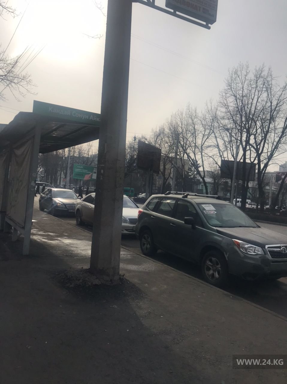 Сразу три машины припарковались на остановке на улице Ибраимова на пересечении с проспектом Чуй. Водителям маршруток приходится останавливаться на второй полосе движения.