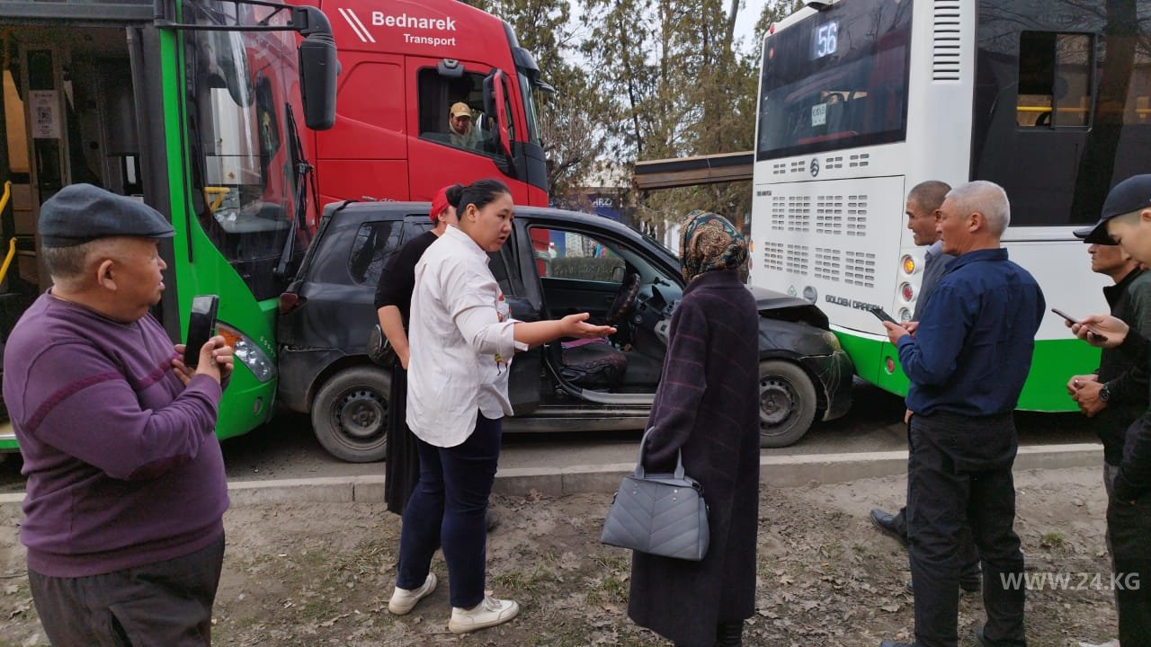 Два автобуса зажали легковой автомобиль. Фотографии 24-kg.com прислал читатель.