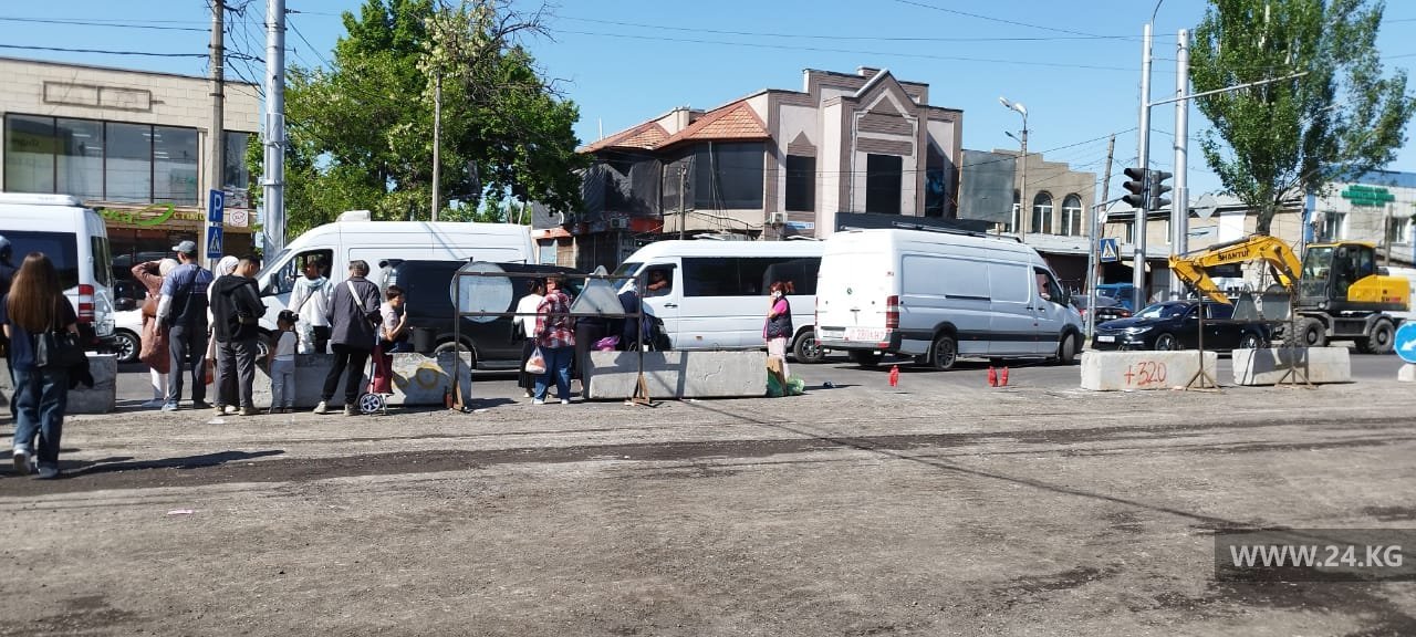 Ремонт дорог в Бишкеке. Люди ждут транспорт на проезжей части