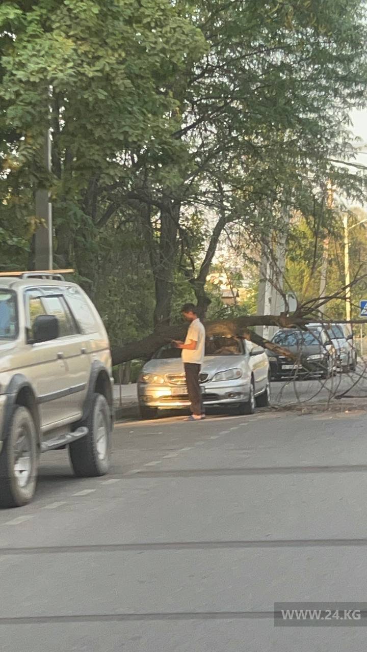 В Бишкеке дерево упало на припаркованный автомобиль. Фото с места происшествия 24-kg.com прислали очевидцы.