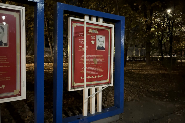 В Бишкеке вандалы опять разбили стенд с портретами Героев Советского Союза, на этот раз расположенный на бульваре Эркиндик. Об этом сообщил читатель.