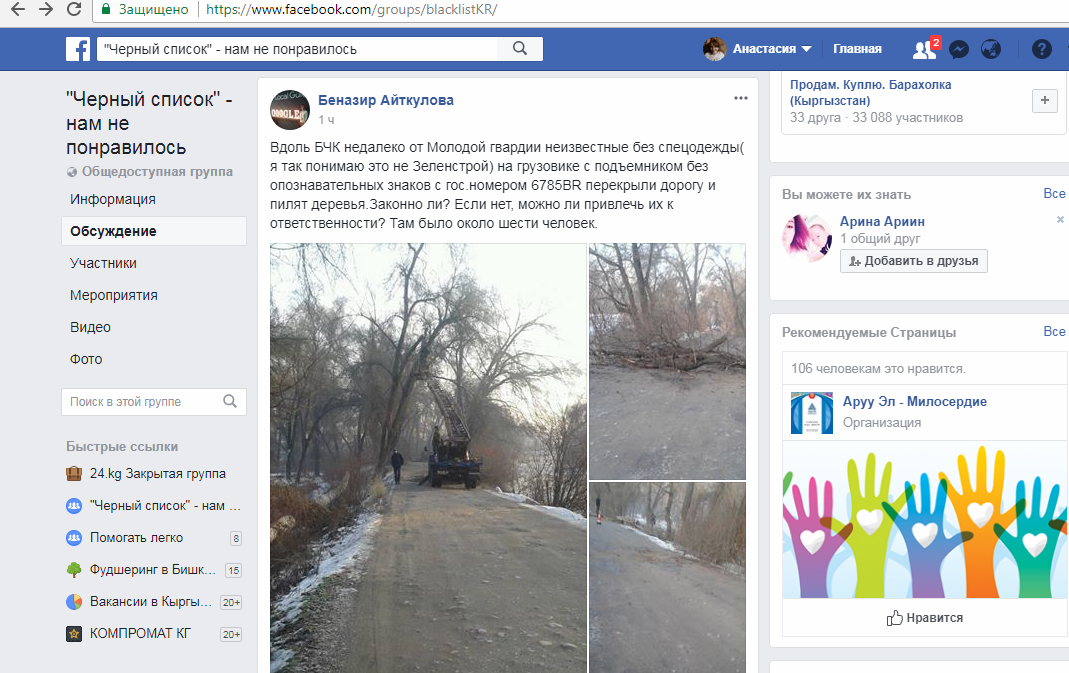 Вдоль БЧК недалеко от проспекта Молодой Гвардии неизвестные без спецодежды на грузовике с подъемником без опознавательных знаков перекрыли дорогу и пилят деревья. Об этом сообщает пользователь Facebook Беназир Айткулова и задается вопросом, законно ли ведутся работы.