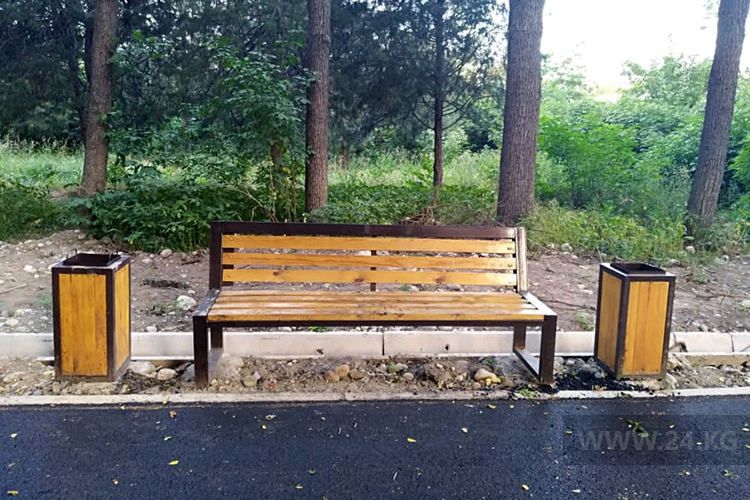 «В настоящее время установлены ворк аут комплекс из 9 тренажеров с бетонным покрытием (более 350 квадратных метров) и ограждением по периметру, опоры освещения (87 штук), в нижней части парка установили 33 скамейки и 66 урн, работы по их установке в верхней части парка продолжаются», — отмечают в администрации.Кроме того, по их информации, завершены работы по электроснабжению парка, прокладке инженерных сетей водопровода и канализации. Бишкекзеленхоз озеленил территорию перед административным зданием парка — посадил более 70 однолетних цветов.