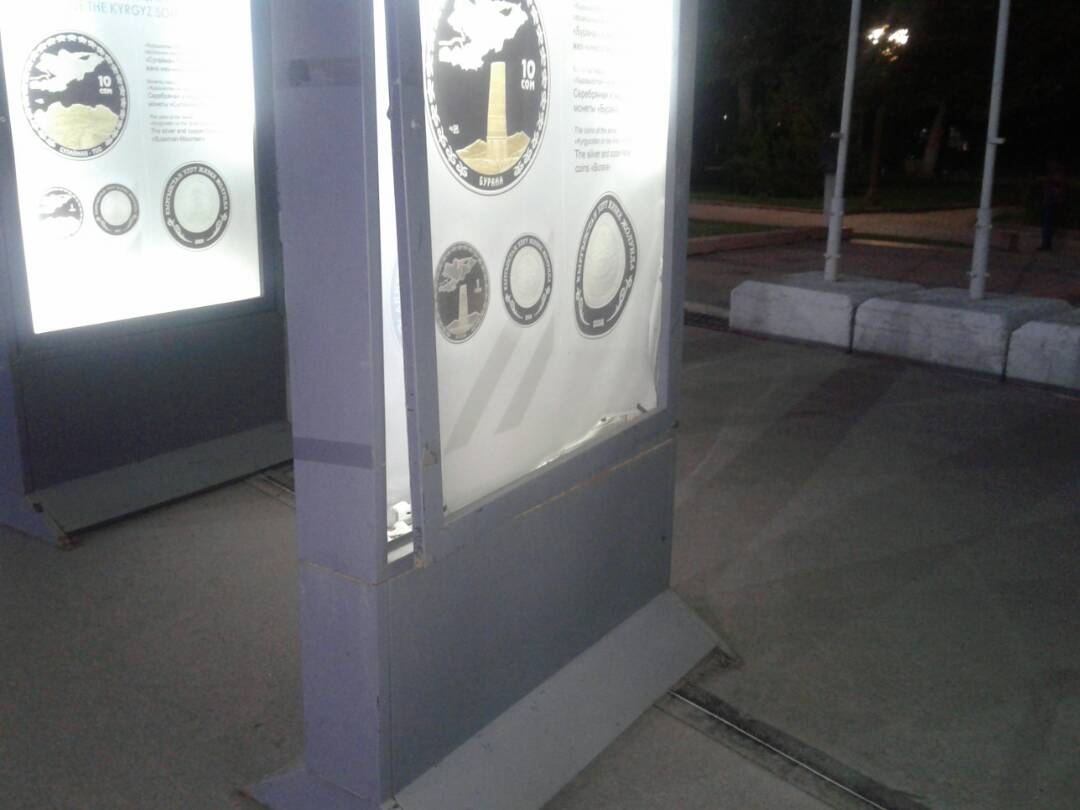 На площади Ала-Тоо стоят сломанные стенды фотовыставки «Памятные монеты Кыргызстана». Об этом ИА «24-kg.com» сообщил читатель.