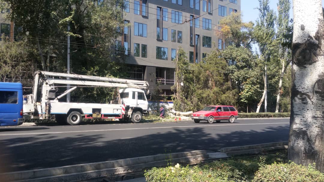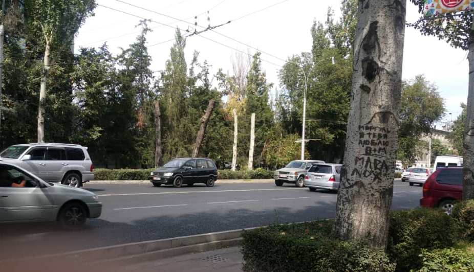 Второй день на проспекте Манаса рубят деревья. Об этом 24-kg.com сообщил читатель.
