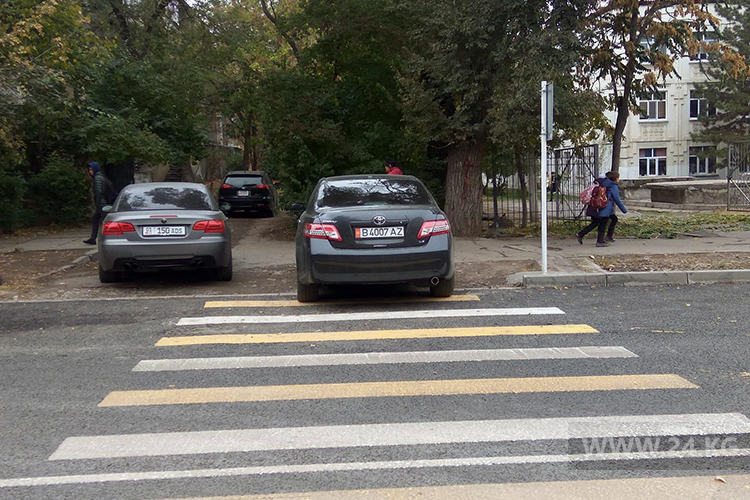 Этот водитель встал на пешеходном переходе возле школы № 68 на пересечении улиц Уметалиева и Токтогула.