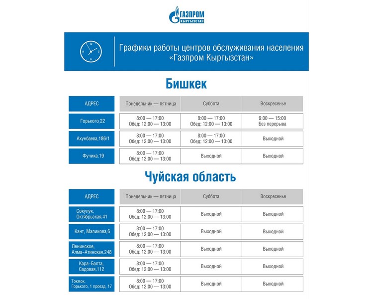 Теперь основной офис «Бишкекгаза» (Горького, 22) работает всю неделю без выходных, а офис на Ахунбаева, 186/1 — с понедельника по субботу.