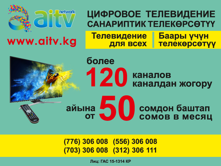 Подключи телевидение с ежемесячной оплатой всего 50 сомов и наслаждайся просмотром рейтинговых кыргызских и зарубежных телеканалов круглосуточно и без перебоев.