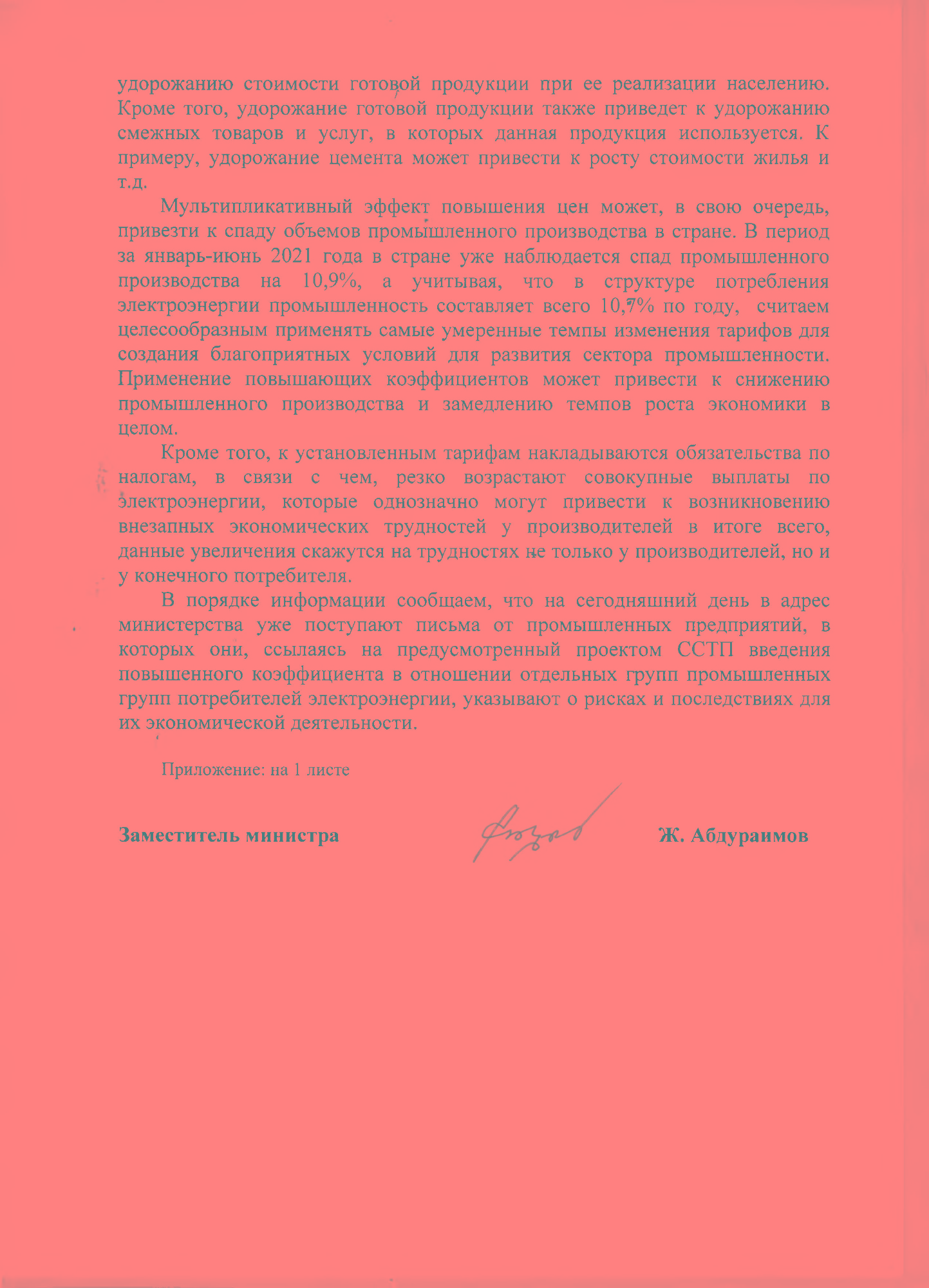В Министерстве экономики и финансов поясняют, что применение коэффициента на промышленный тариф приведет к повышению цен на производимую продукцию, что в свою очередь приведет к снижению уровня конкурентоспособности на рынке и создаст благоприятные условия для вхождения на рынок республики импортной продукции.
