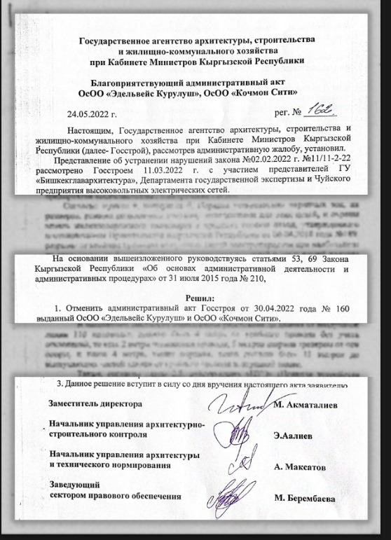 - Комиссия Госстроя, рассмотрев административную жалобу ОсОО «Кочмон Сити», отменила решение от 30 апреля 2022 года № 160 об отзыве разрешительных документов решением от 24 мая 2022-го № 162 (скан прикреплен).