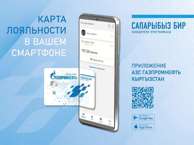 Клиенты АЗС «Газпромнефть» могут выпустить виртуальную карту лояльности «Сапарыбыз бир» в мобильном приложении «Газпромнефть Кыргызстан» бесплатно. Для участников программы лояльности стал доступен сервис виртуализации карт.