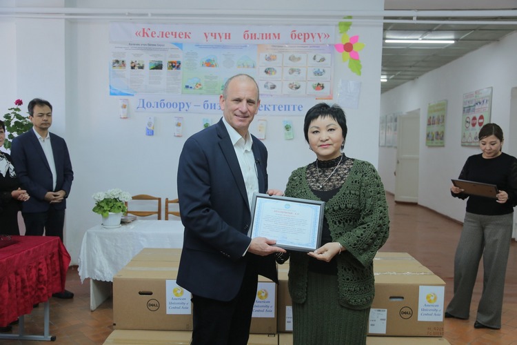 Директор этой школы Чинара Макеева обратилась в АУЦА с просьбой о помощи в обеспечении компьютерами вверенного ей учебного заведения. Администрация АУЦА рассмотрела это обращение и изыскала возможность оказать помощь школе и подарить 20 компьютеров.