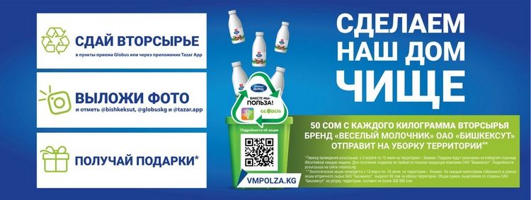 В рамках проекта бренд «Веселый молочник» направит 50 сомов с каждого килограмма собранного сырья на уборку выбранной на сайте акции территории.