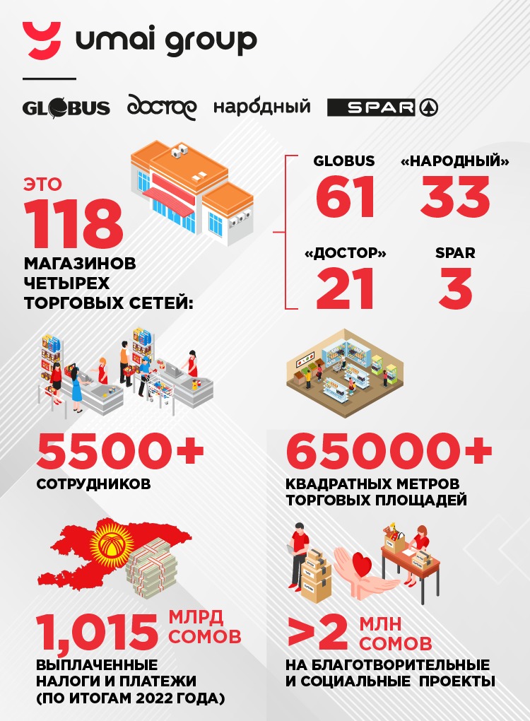 «Умай Групп» уже 21 год работает на благо каждого кыргызстанца и стремится сделать их покупки еще более выгодными, качественными и удобными. Уходящий, 2023 год не стал исключением. По всей стране продолжили открываться любимые жителями магазины сетей Globus, «Достор» и SPAR. Это всегда товары высочайшего качества по низким ценам с удобным графиком работы и поддержкой покупателей.