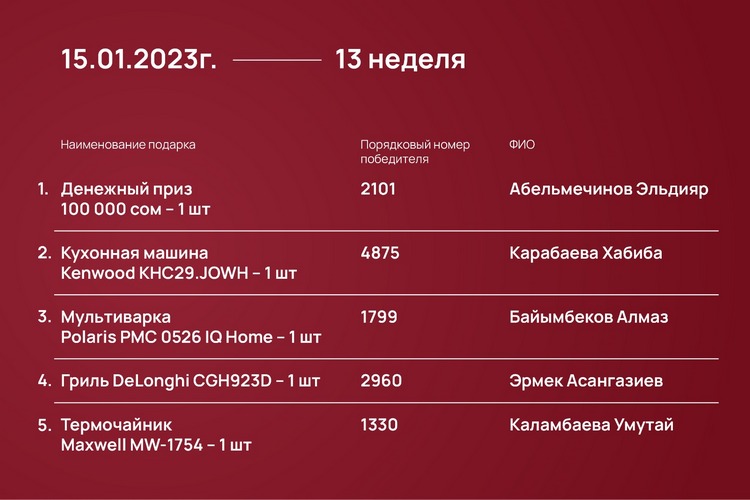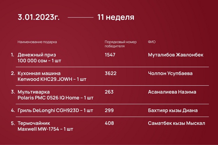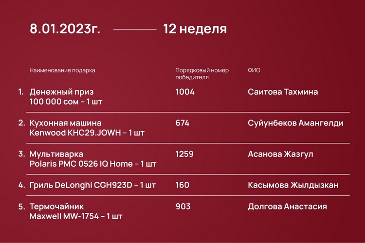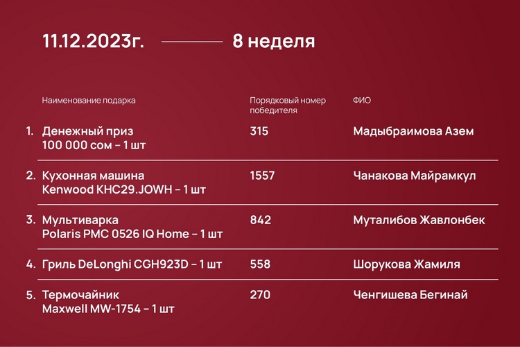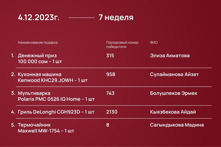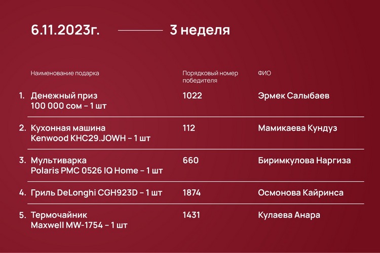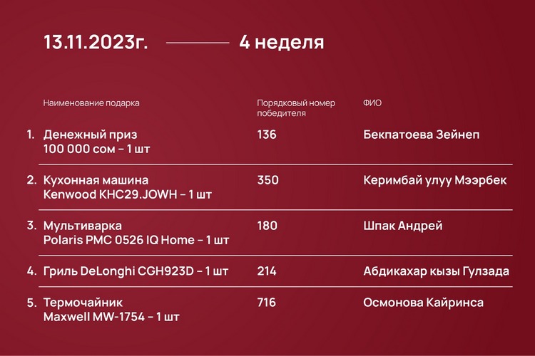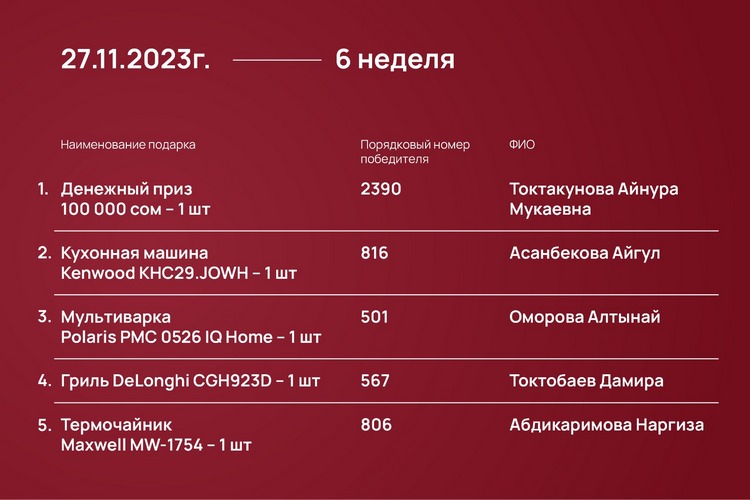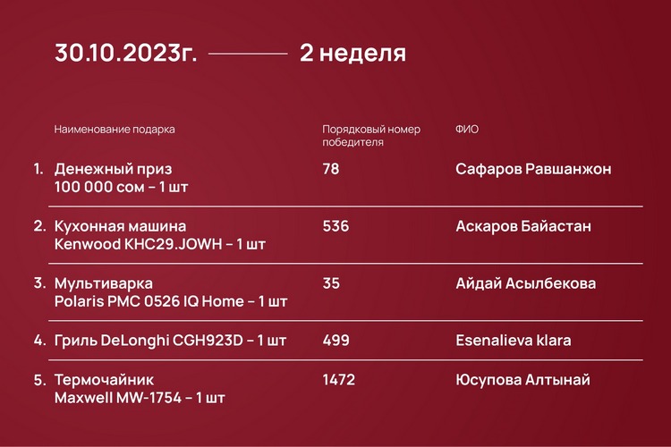 Розыгрыш проходил каждый понедельник с 23 октября 2023 года до 15 января 2024-го при помощи генератора рандомных чисел https://randomus.ru/.