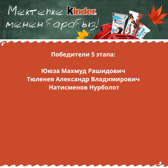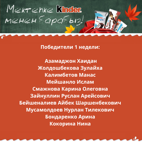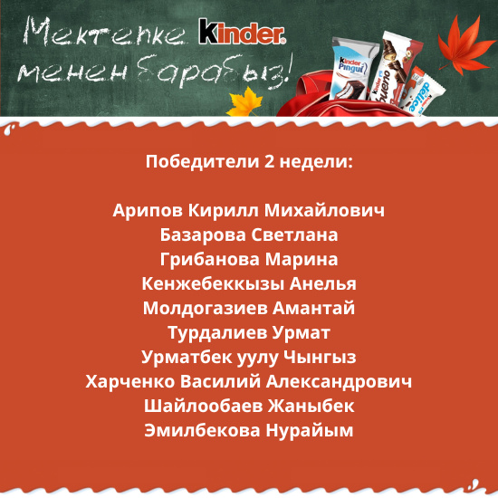 Торговая марка ОсОО «R.G. Company» запустила стимулирующую лотерею под названием «Идем в школу вместе с Kinder», которая проводилась с 12 августа по 8 сентября 2024 года.