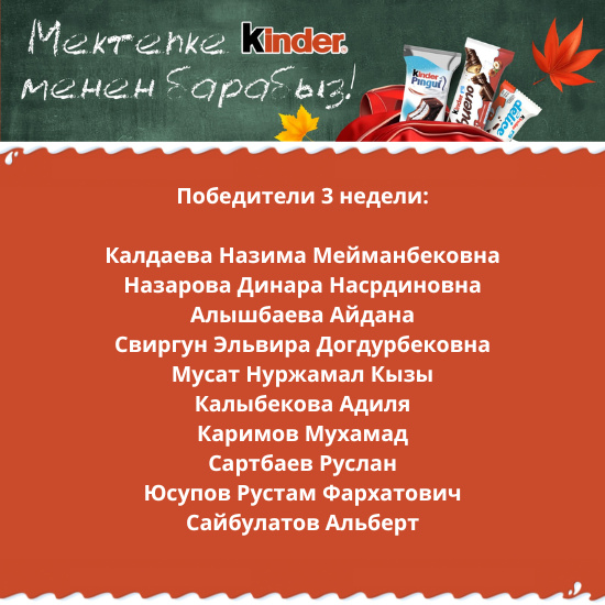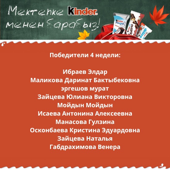 - совершить покупку любых продуктов Kinder на сумму от 200 сомов в одном чеке в гипермаркетах и супермаркетах «Глобус»;