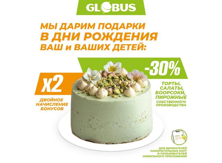 Это часть программы лояльности и еще один приятный бонус от сети магазинов Globus. В день рождения покупатель получает скидку 30 процентов на товары собственного производства — торты, салаты, боорсоки и пирожные, а также двойное начисление бонусов. Такие же скидки и условия предусмотрены и в дни рождения ваших детей. Это решение помогает сэкономить средства при организации ваших праздников.