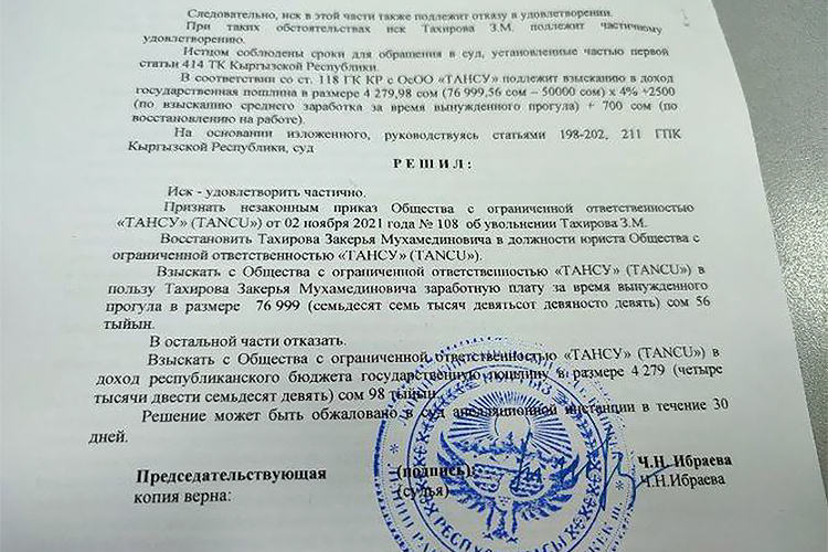 Вступившим в законную силу решением от 27 апреля 2022 года Ленинский районный суд Бишкека признал приказ об увольнении Тахирова незаконным и восстановил его в занимаемой должности.