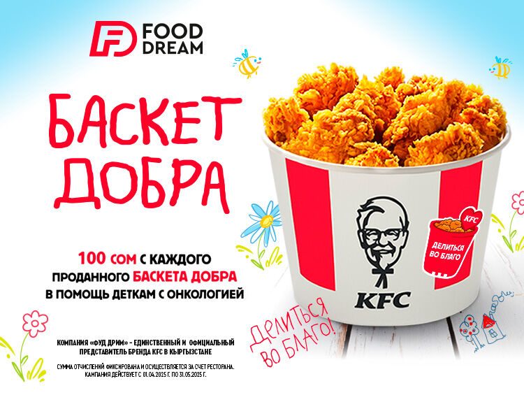 Компания Food Dream, официальный представитель бренда KFC в Кыргызстане, с радостью сообщает о продлении благотворительной кампании «Баскет Добра» до 31 мая. Проект, стартовавший в апреле, собрал вокруг себя неравнодушных людей, объединенных важной целью — поддержать детей, борющихся с онкологическими заболеваниями.