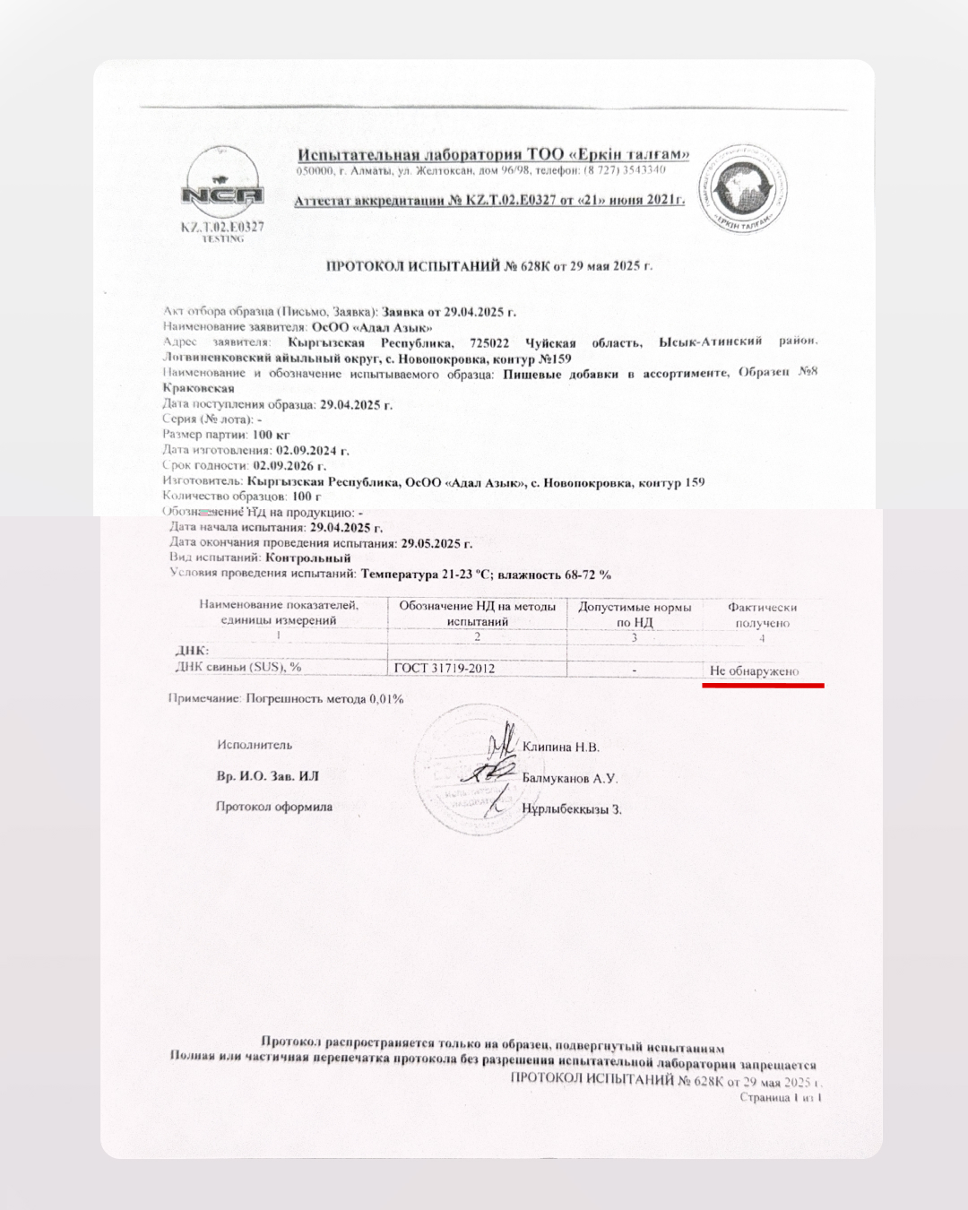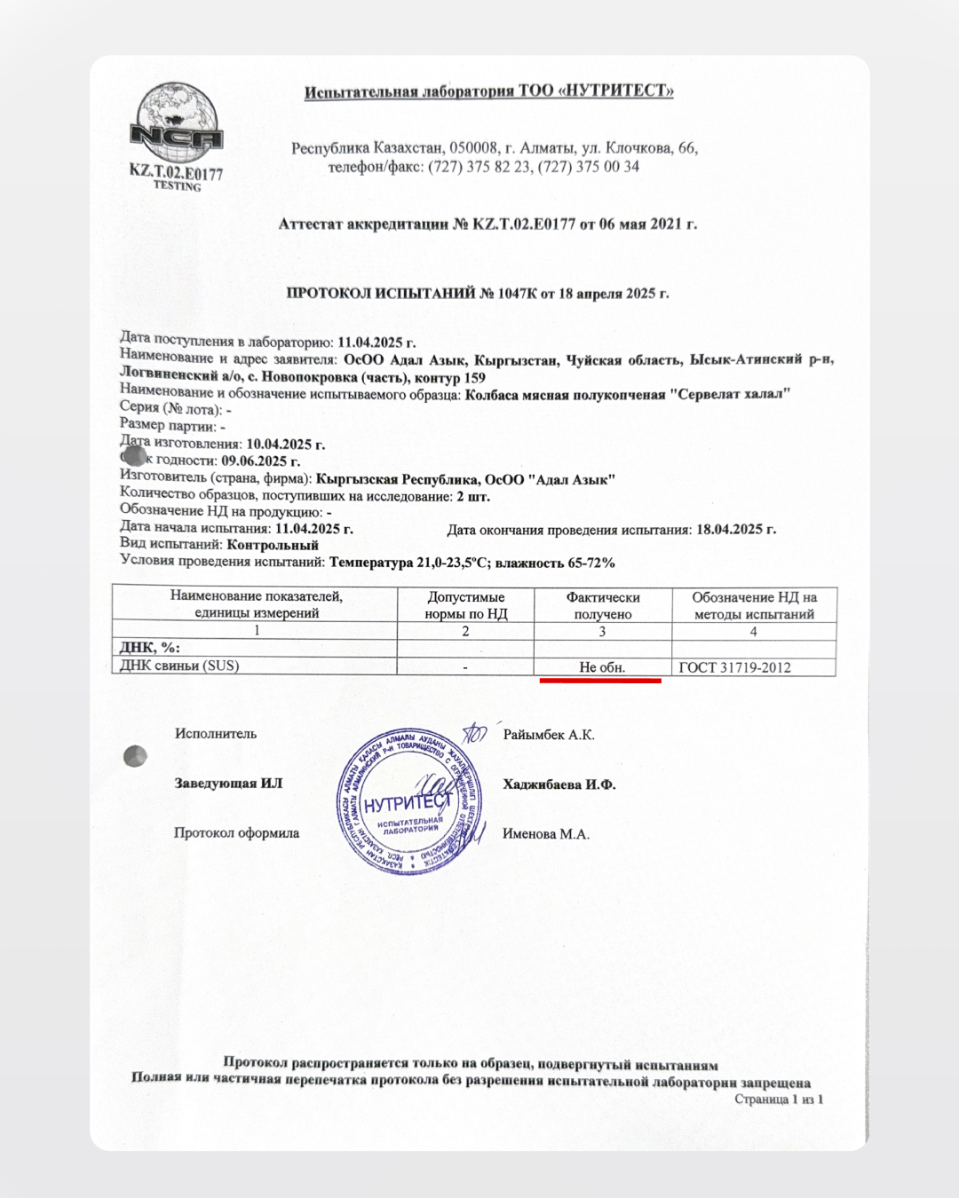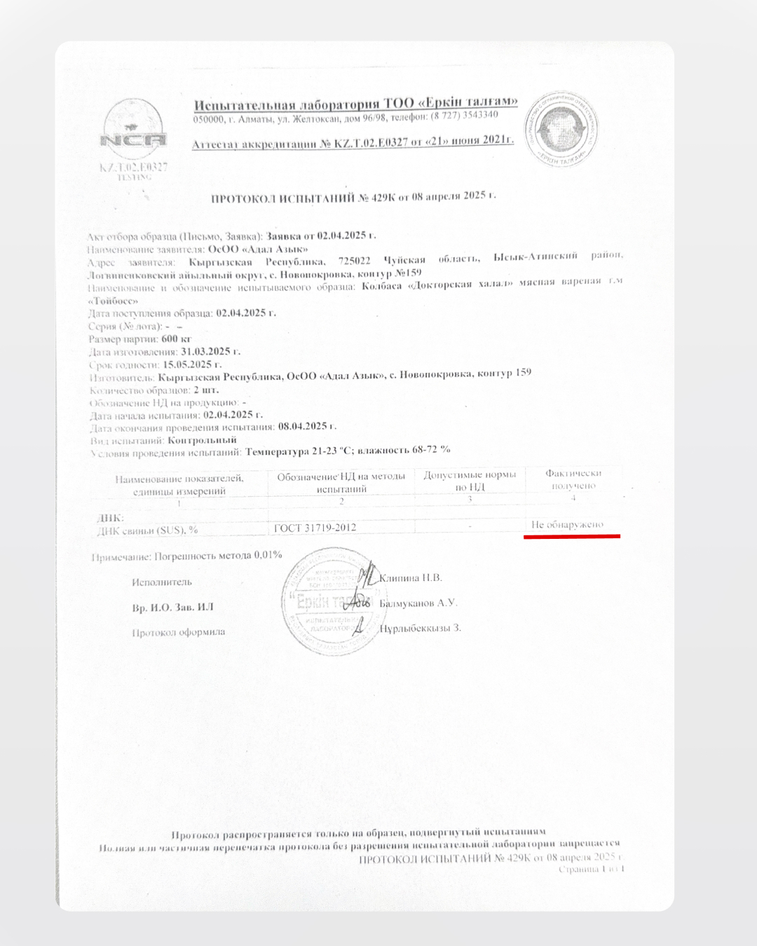 По данным независимых лабораторий, в образцах колбасы и других изделий не обнаружено ДНК свинины и компонентов, которые противоречат требованиям халал.