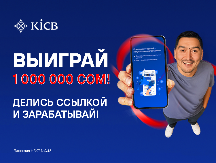 Если вы активный пользователь и совершаете оплату посредством платежных карт и мобильного приложения KICB, то вы также становитесь претендентом на второй главный приз акции в 1 миллион сомов.Скачивайте мобильное приложение KICB и выигрывайте призы вместе с друзьями и близкими. Срок проведения акции — с 1 сентября по 30 ноября 2025 года. Более подробно об условиях здесь.