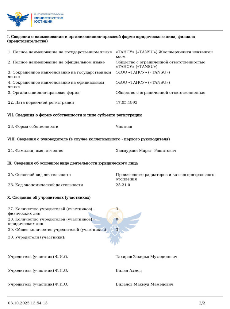 Казалось бы, ну вот и все, справедливость восторжествовала. Но с 2020 года и по настоящее время Закерья Тахирова так и не допускают к принадлежащему ему ОсОО «ТАНСУ», его активам и документации, хотя он является единственным учредителем компании.Потому что по базе Минюста учредителями ОсОО «ТАНСУ», кроме Закерья Тахирова, все еще значатся Билал Ахмед и Махмуд Билалов, а гендиректором — уволенный еще в 2022 году Марат Ханмурзин.