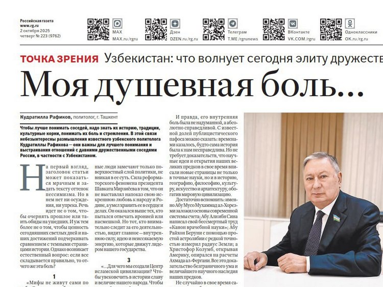 «Я и сегодня остаюсь при прежнем убеждении: Узбекистан и его народ, много лет вынужденные жить в бедах и испытаниях, ныне идут не только по пути укрепления государственного суверенитета. Мы возвращаем себе то, что было забыто и безжалостно вырвано из сердца, — память о великом прошлом, культуру и наследие предков. Этот благородный труд — не просто возрождение истории, это поиск подлинного лица нации, обретение духовной силы и обновления. В этом наша истина и объективная справедливость», — пишет политолог.