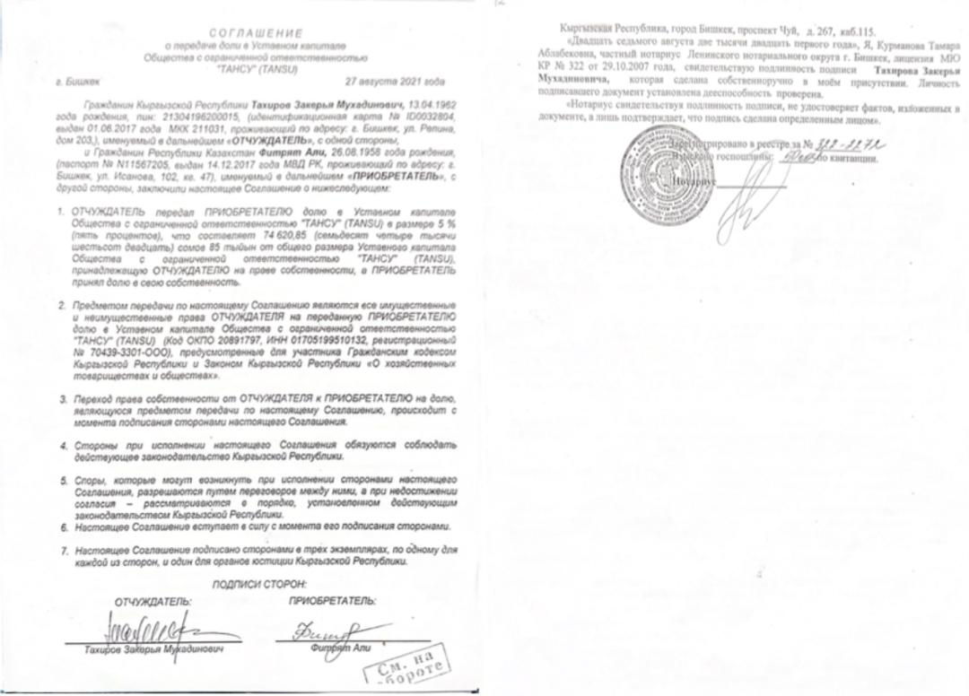 Что касается претензий Тахирова к Министерству юстиции об отказе в перерегистрации, то следует отметить, что в настоящее время продолжаются судебные процессы, инициированные нами с целью оспаривания его предыдущих действий по изменению состава участников и учредительных документов ОсОО «ТАНСУ», пояснил предприниматель.По его мнению, отказ Минюста в перерегистрации не является необоснованным, а связан с продолжающимися судебными спорами, инициированными для обжалования предыдущих корпоративных действий.
