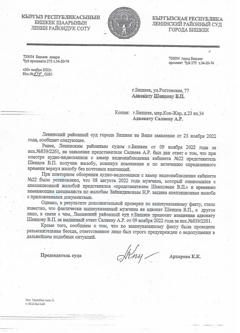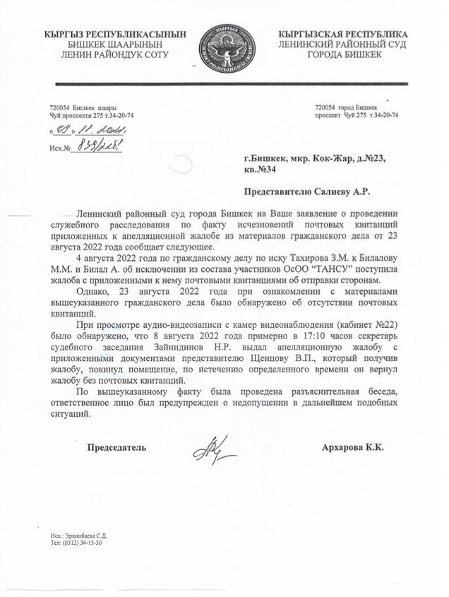 По его словам, в одном из писем председателя Ленинского районного суда Кымбат Архаровой указывалось, что к пропаже мог быть причастен представитель Тахирова. Затем в суде уточнили, что однозначно утверждать о конкретной личности причастного невозможно. Но факт пропажи квитанций остается установленным (соответствующие письма прилагаются).