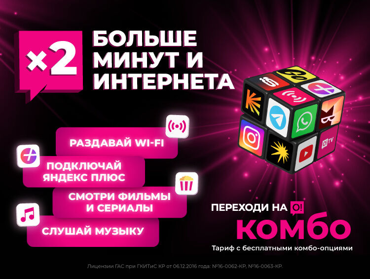 Управлять комбо-опциями можно в приложении «Мой О!». Там же вы можете активировать бесплатную подписку O!Prime на 90 дней, которая дает еще больше интернета: +10 ГБ дополнительного интернета, кешбэк до 100 процентов и 0 процентов комиссии за платежи!