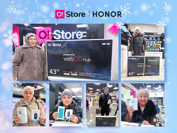 Новогодние сюрпризы в O!Store на этом не заканчиваются. Прямо сейчас продолжается масштабная акция для всех, кто планирует обновить смартфон. При покупке устройства Honor каждый покупатель гарантированно получает подарок. Смартфоны Honor можно приобрести в рассрочку от 1 тысячи 67 сомов в месяц. Заказывайте их онлайн в приложении «Мой О!» с бесплатной доставкой по Бишкеку: https://market.o.kg/ru/blocks/7386