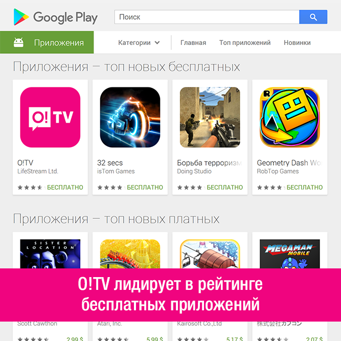 O!TV стремительно поднялось на первое место в рейтинге бесплатных приложений в Google Play, оттеснив другие популярные сервисы. А в App Store приложение входит в